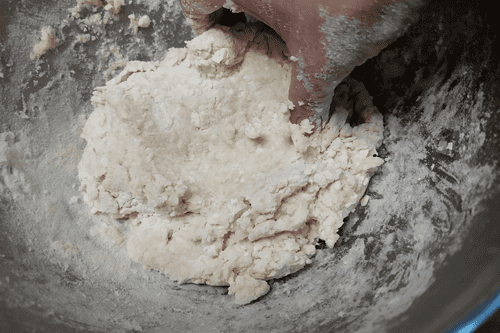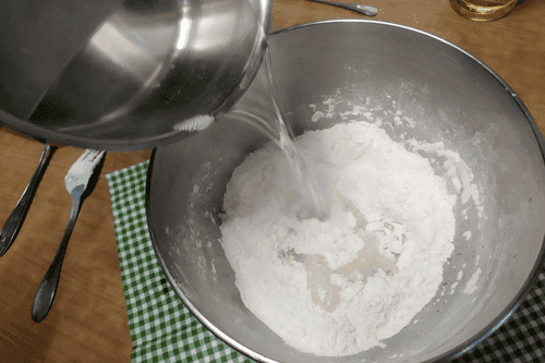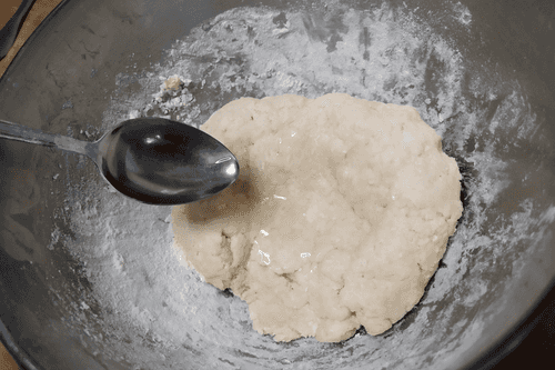 Start kneading the dough immediately. While it's hot — with a fork, then with hands.
