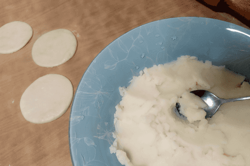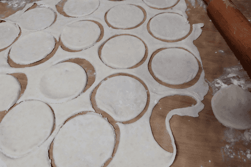Roll out the dough into a thin layer and cut out circles of suitable diameter with a glass or cup.