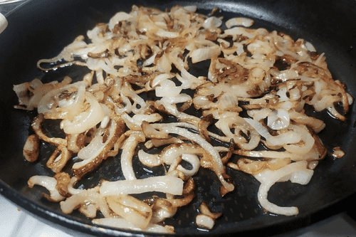 Fry the onion, sliced into half rings, in vegetable oil until golden brown.