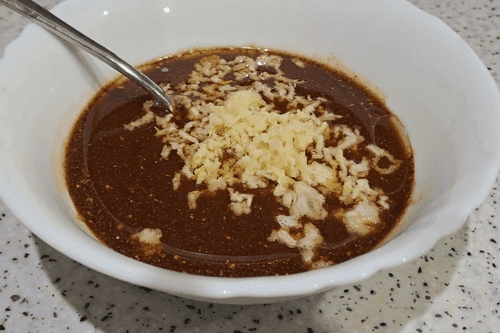Peel the garlic, wash it well, press it through a garlic press, and add it to the prepared marinade.