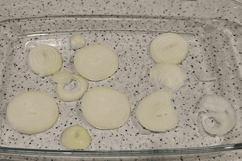 Peel the onion, wash it well under running water, slice it into rings, and place it in a baking dish.