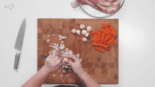 Peel the garlic, slice the large cloves lengthwise, and you can leave the small ones whole.