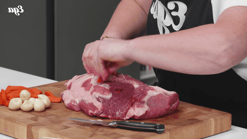 Insert a piece of carrot and garlic into each cut. Set aside 1-2 cloves of garlic.