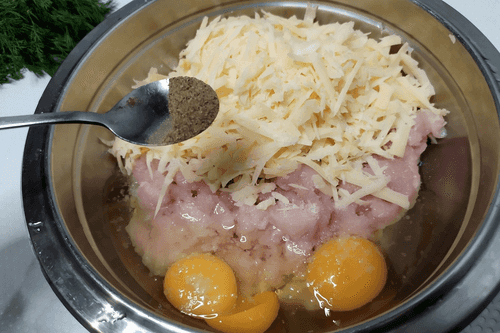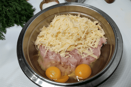 Combine the minced fillet and cheese in a bowl, add 2 chicken eggs.