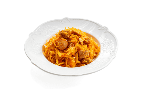 Mix tomato paste with water, pour this mixture over the cabbage, add sausages, return the meat to the pan, and simmer covered on low heat for about 30 minutes, until the cabbage is tender. At the end, season the stew with salt, pepper, and sugar to taste.