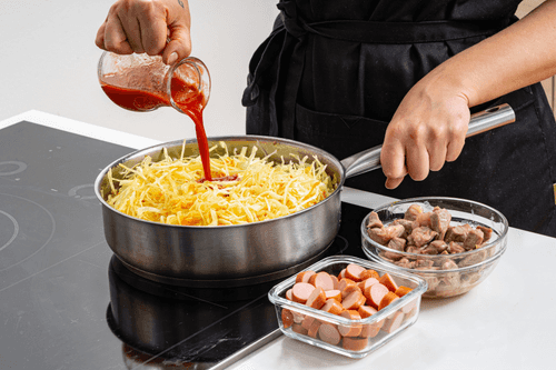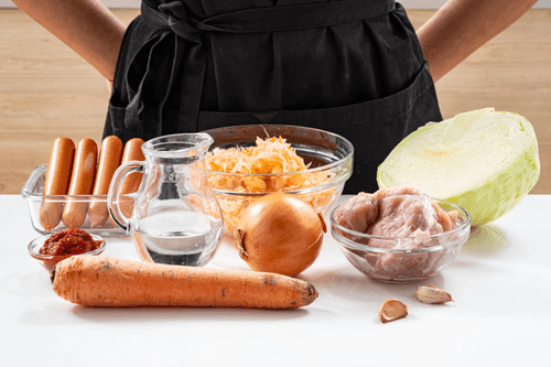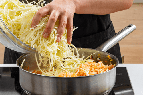 Add fresh and pickled cabbage, mix, and simmer for a few minutes until the cabbage reduces in volume.