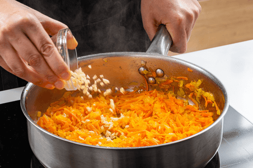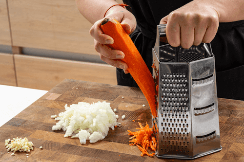Chop the onion into small cubes, grate the carrot on a coarse grater, and chop the garlic very finely.