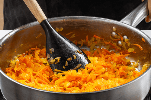 In the same pan, sauté the onion and carrot until soft, adding oil if necessary.