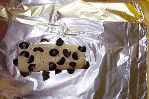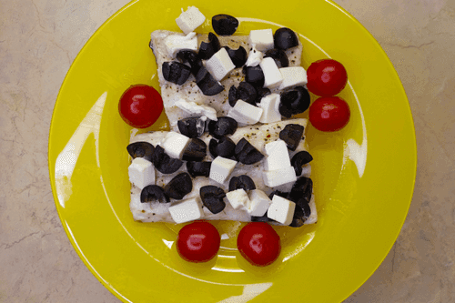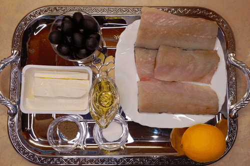 Prepare a sheet of foil measuring 30x40 cm, grease the center with vegetable oil, place the fillet, and add olives on top.
