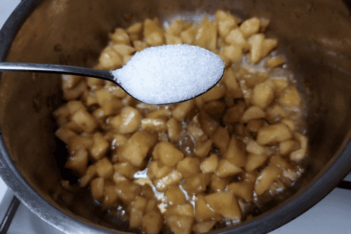 Sprinkle sugar (the amount can be adjusted to taste). Stir and simmer for another 2-3 minutes until the apples are soft and golden.