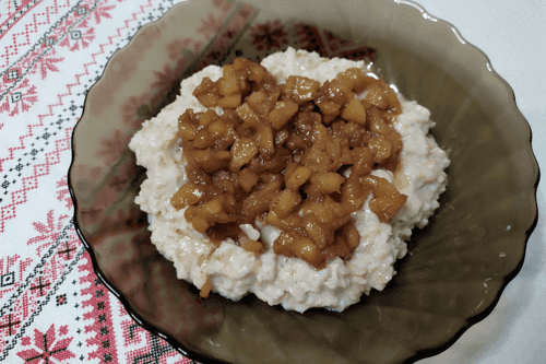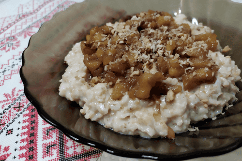 Oatmeal with baked apple and nuts is a cozy dish of Russian cuisine, infused with warmth and childhood aromas. The oatmeal cooked in a mix of milk and water becomes tender and velvety, while caramelized apples with cinnamon and vanilla add sweetness and a hint of spice. The finishing touch is walnuts, adding texture and a slight crunch. It's the perfect breakfast that warms on cool mornings, provides energy, and is rich in vitamins.