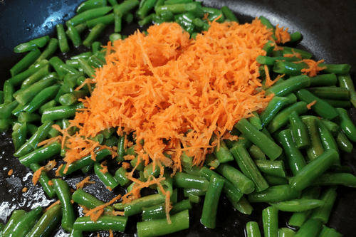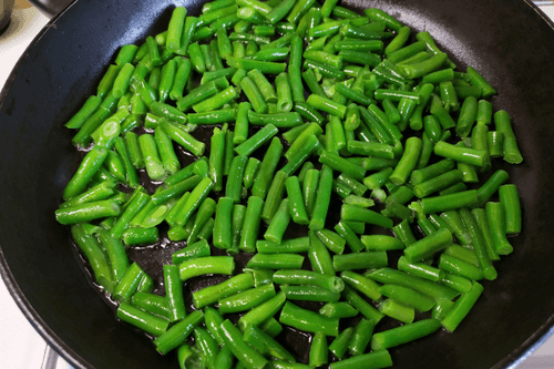 Fry the green beans in a small amount of vegetable oil until soft.