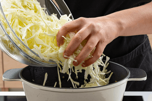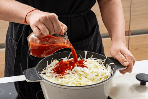 Mix tomato paste in water, pour this mixture over the cabbage, add a little salt, cover with a lid, and simmer on low heat for about 40 minutes, stirring occasionally.