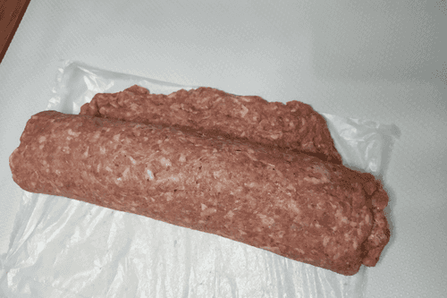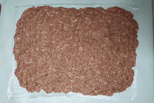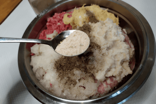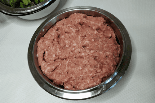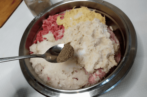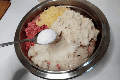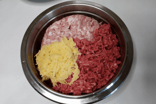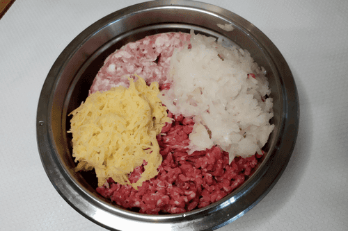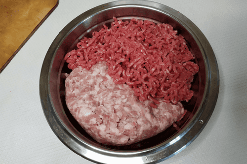 In a deep bowl, combine two types of minced meat - pork and beef.
