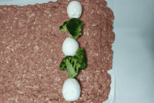 On one edge, alternate boiled eggs and broccoli florets on the minced meat.