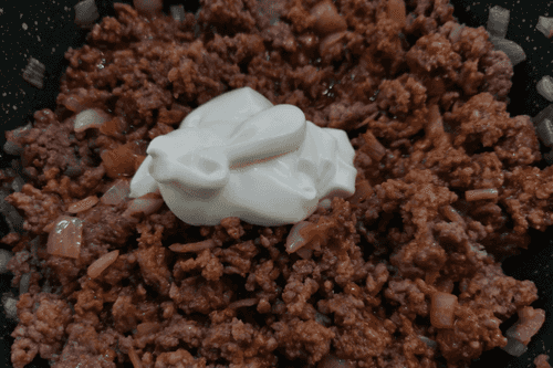 Place the minced meat in a baking dish, top with mashed potatoes, then sprinkle with remaining cheese. Send to a preheated oven at 180 degrees.
