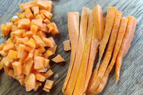 Peel the carrot and cut it into small pieces.