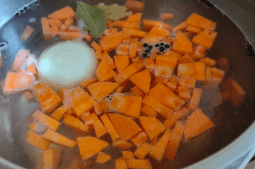 Peel the onion and add it whole to the pot with carrots. Also add bay leaf and pepper.