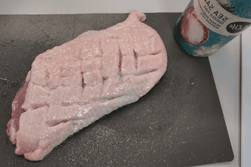 Make shallow cuts on the skin of the duck breast (without cutting into the fillet) and salt it.