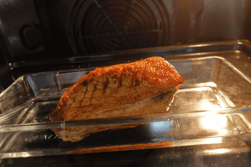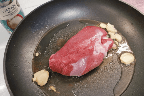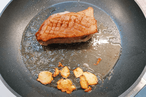 Place the duck skin-side down in a dry heated pan. Once the fat melts, add garlic and salt.