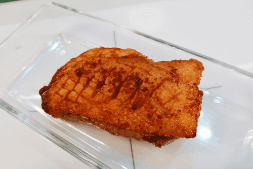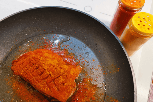Once the skin is nicely browned, flip it and reduce the heat to medium.