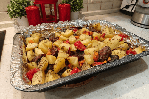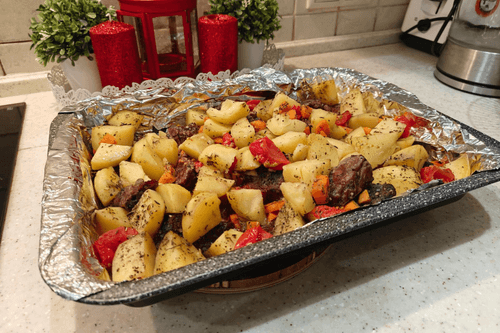 Beef with potatoes and tomatoes in the oven