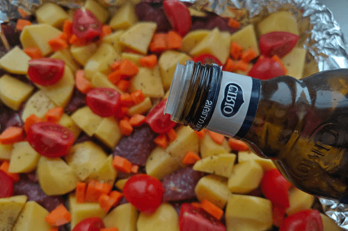 Place all the vegetables in a baking tray and drizzle with olive oil.
