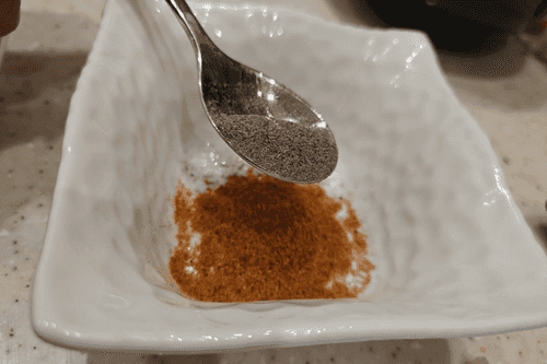 In a separate bowl, mix paprika, pepper, salt, and dry garlic.