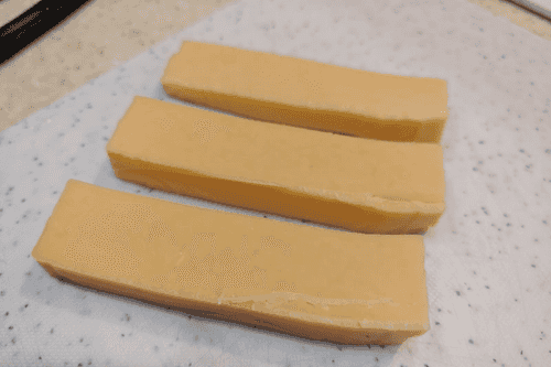 Cut the cheese into three long strips.