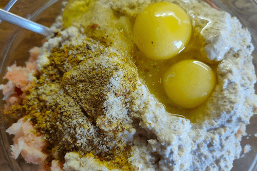Add eggs and spices.