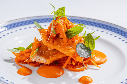 Fried pollock with tomato sauce