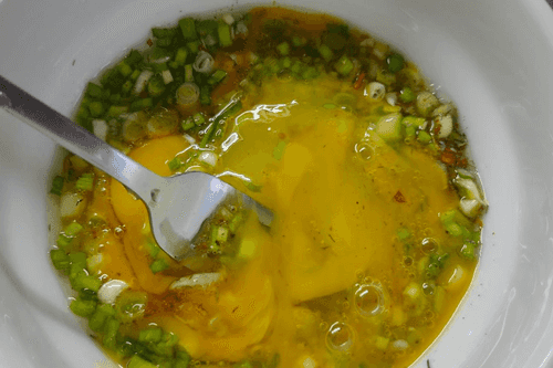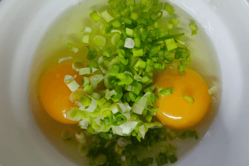 Crack the eggs into a bowl and add chopped onion.