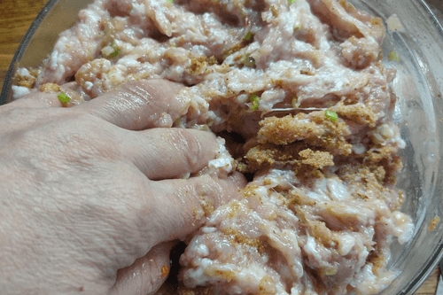 Add breadcrumbs to the minced meat mixed with egg and onion.
