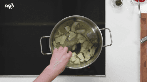Cut the celery root randomly. The smaller the pieces, the faster it will cook. Also, chop the onion.