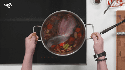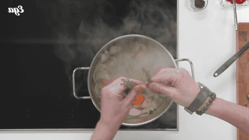 Add 3 unpeeled garlic cloves, chopped carrot and celery, then a few sprigs of thyme, allspice and black pepper, and tomato paste. Sauté everything together until lightly caramelized.