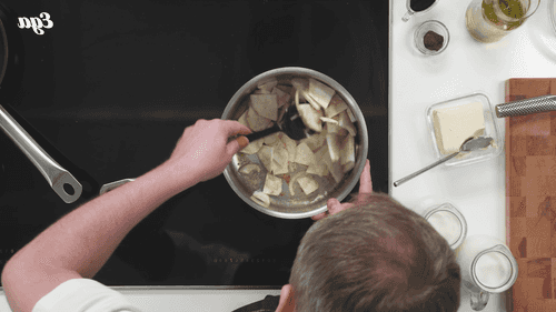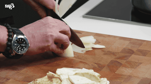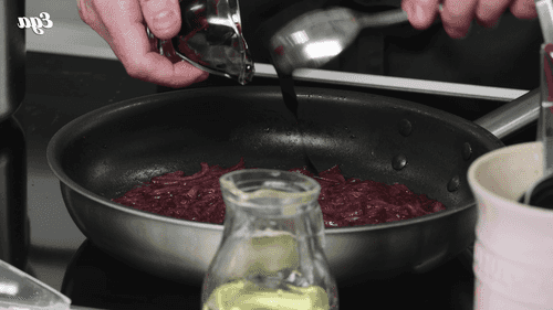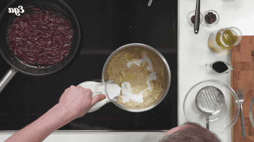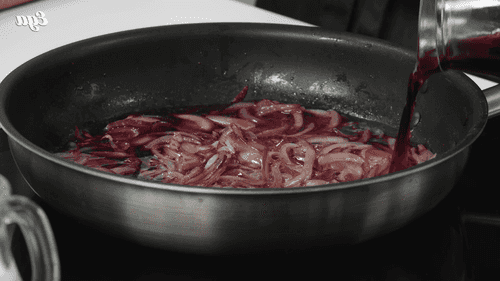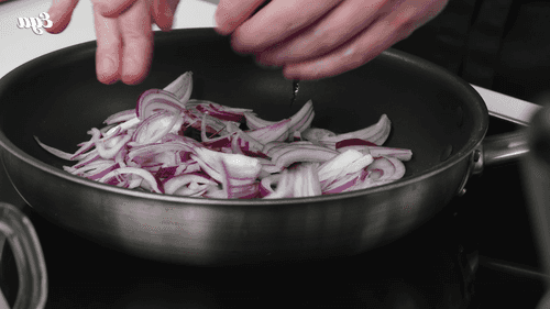 Slice the red onion into strips and sauté it in a pan with olive and butter over low heat, stirring constantly.
