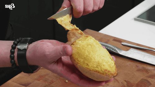 Peel the baked potatoes, and slice them into rounds about 7 mm thick.