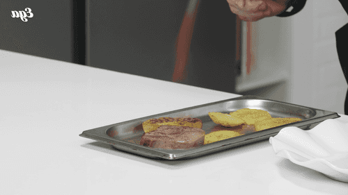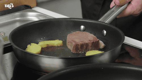 In the same skillet, add the potatoes, 2 whole garlic cloves, and 2 sprigs of thyme, along with a piece of tongue 2-3 cm thick. Sear everything on both sides and transfer to the baking tray with the foie gras. Place the tray in the oven for 2 minutes.
