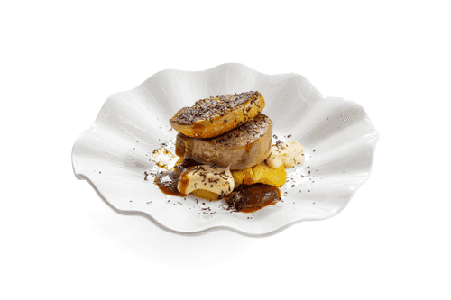 Heat olive oil in a pan and quickly fry the foie gras until caramelized on both sides. Transfer to a clean baking sheet.