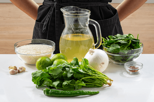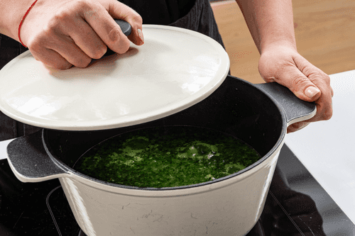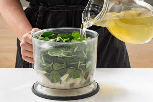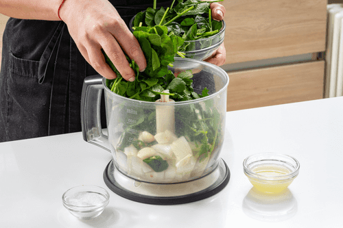Add cilantro, spinach, garlic, lime juice, and 0.5 teaspoon of salt to it.