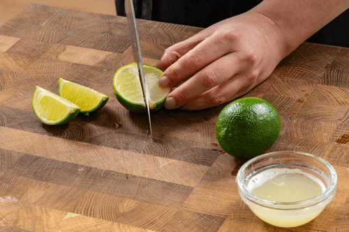 Squeeze 30 ml of juice from the limes. Cut the remaining limes into wedges for serving.