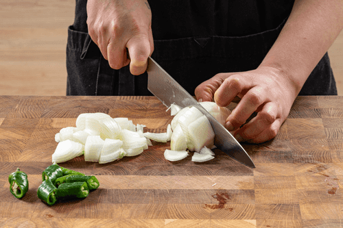 Chop the onion and chili coarsely with seeds and put them in the blender bowl.