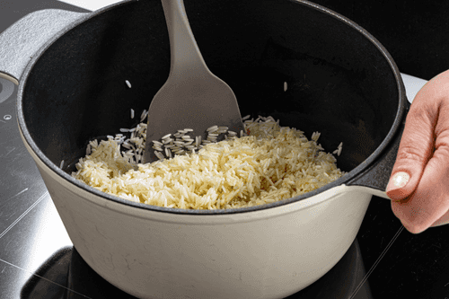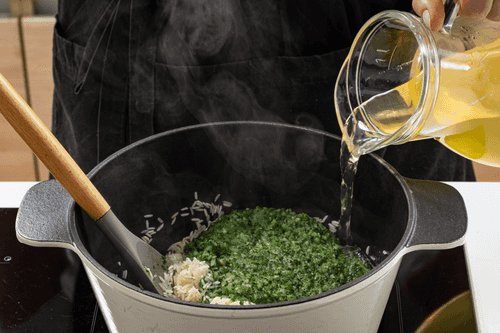 Heat olive oil in a pot and sauté the rice for 2-3 minutes.