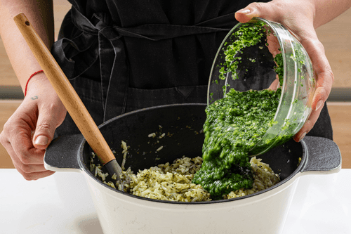 Mix the remaining green mixture into the rice. Taste and add salt or sugar to your liking.