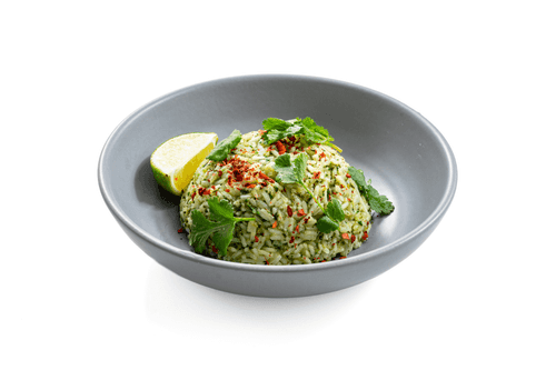 Serve green rice as a standalone dish or as a side, garnished with a lime wedge and chili flakes.