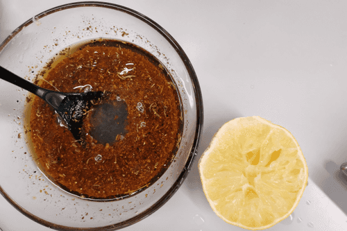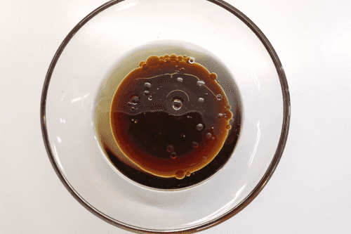 In a deep bowl, mix olive oil and soy sauce.