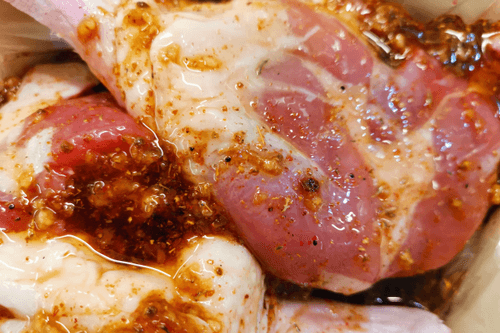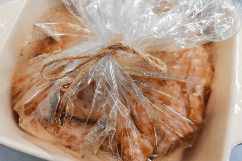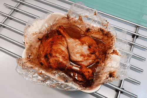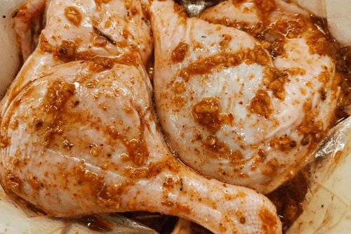 Place the legs in the sleeve and pour the resulting marinade over them.