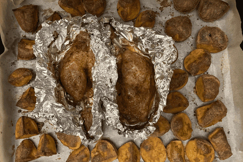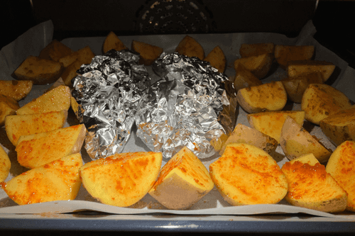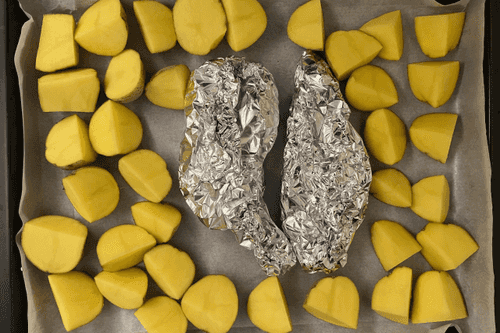 Place the meat and potato wedges on a baking sheet lined with parchment.