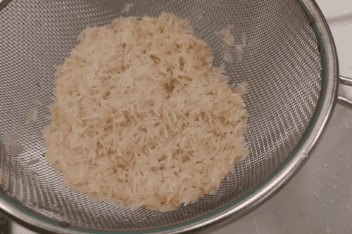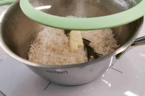 After 20 minutes of boiling, the rice is ready. Remove the rosemary and garlic from the pot.