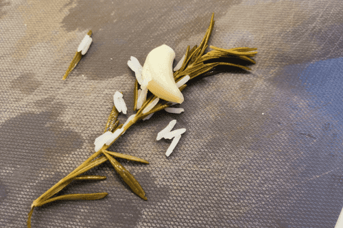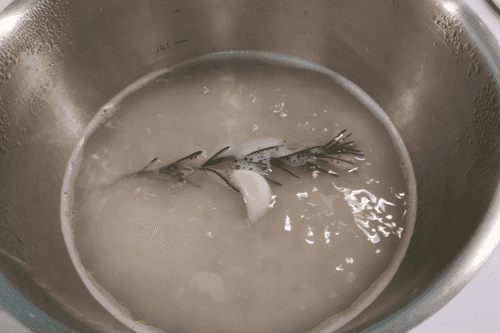 Add rice and reduce the heat. Add garlic and a sprig of rosemary.